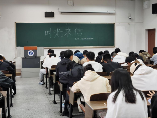 书信撰写环节持续约40分钟,同学们在信纸上填写姓名、学号、班级,内容涵盖学业目标、职业规划、生活期待等多个方面。工作人员在教室内轻声引导,拍照员捕捉下一个个专注书写的瞬间。未能完成的同学也得到了适当的延时,确保每位参与者都能充分表达心声。