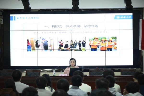 谢俪系统阐述了新时代工科学生干部应当具备的“四有”能力:一是“有脚力”,深入基层,站稳立场;二是“有眼力”,洞察细微,明辨是非;三是“有脑力”,勤于思考,勇于创新;四是“有笔力”,书写精彩,传递价值。