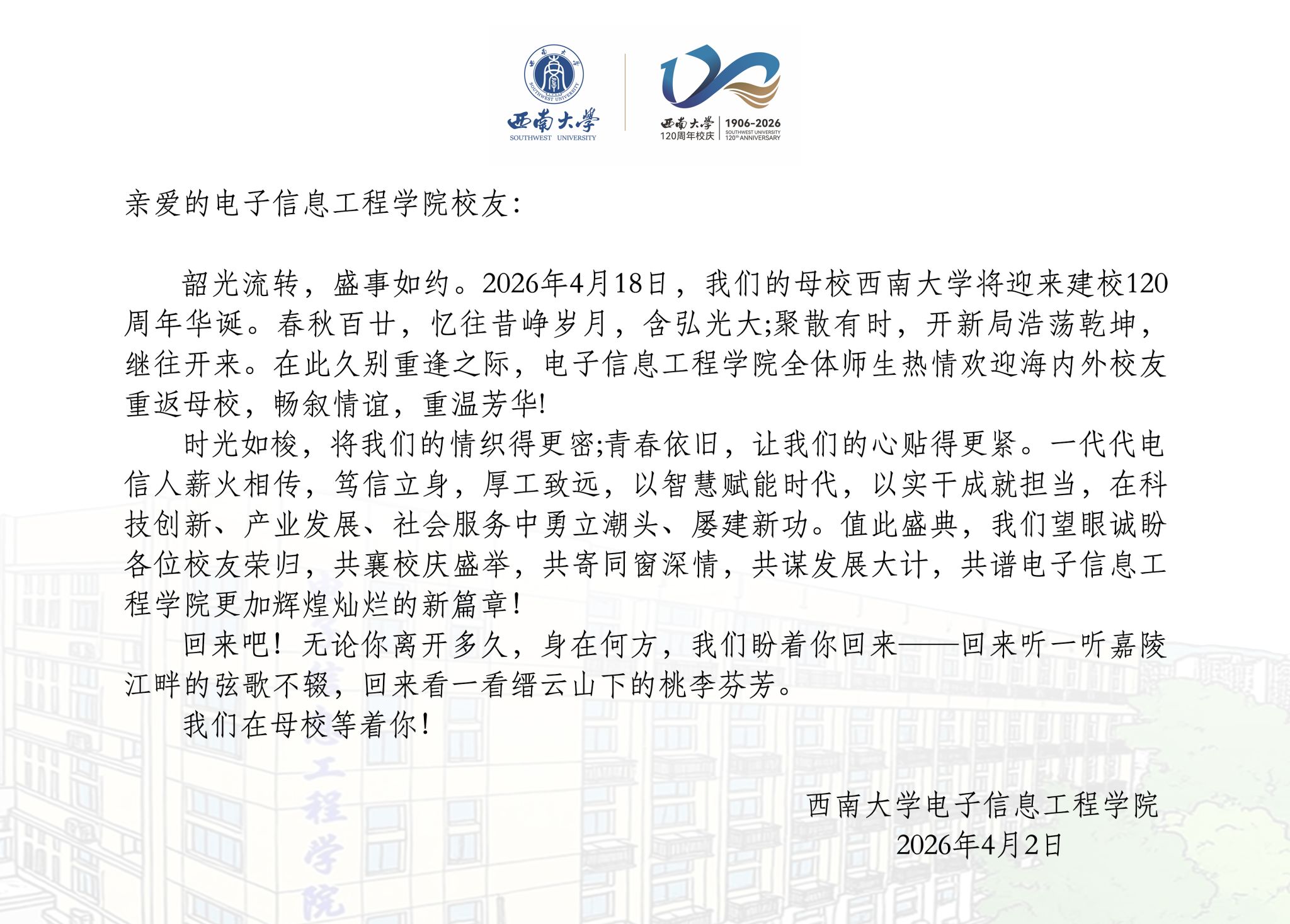 上一条:关于筹备成立西南大学电子信息工程学院校友会的公告