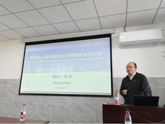 随着人工智能与深海装备技术的深度融合,智能故障诊断正为极端环境作业带来前所未有的安全保障,推动深海探测迈向“自主、自愈”的新阶段,相关研究已引发控制、海洋、交通等多学科科研人员的广泛关注。11月25日,学院特邀清华大学何潇教授作“深海载人潜水器的故障检测与诊断”专题报告,系统阐释主动故障诊断如何突破传统被动框架、以辅助信号激励显著提升“蛟龙号”关键故障的可检测度。本次讲座由学院院长李鸿一教授主持并致辞,多名师生到场聆听,现场交流气氛热烈。
