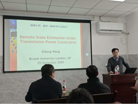 随着无线传感网络在工业监测、智慧农业、健康医疗等领域的广泛应用,如何在能量受限的噪声信道中实现高精度远程状态估计,已成为控制与通信交叉领域的关键挑战。11月25日,学院特邀英国伦敦布鲁内尔大学王子栋教授就“传输功率约束下的远程状态”做主题报告。本次讲座由学院院长李鸿一教授主持。