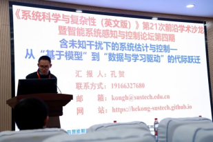 国家海外高层次青年人才、南科大-机器人研究院副院长孔贺教授带来了以《含任意未知输入下的状态估计与参数辨识》为题的报告,聚焦含未知输入系统的卡尔曼滤波应用难题,围绕噪声协方差未知或不精确、系统非强可观等实际情况,讨论了噪声协方差的可辨识性问题。该报告由国家级青年人才、同济大学董怡教授主持。