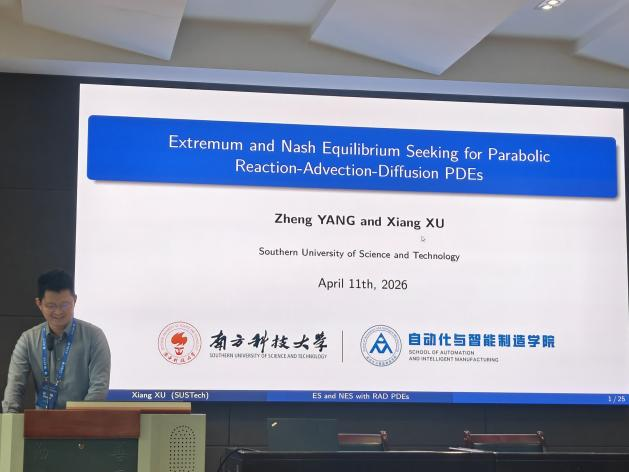 国家优秀青年科学基金(海外)获得者、南方科技大学徐翔副教授以《抛物型RAD-PDE的极值和Nash均衡搜索》为题,围绕非合作博弈的纳什均衡寻求问题,介绍了将极值搜索与纳什均衡理论扩展至反应-对流-扩散偏微分方程执行器动态,并结合无限维反步法与循环小增益定理,实现大规模多智能体系统分布式边界控制。该报告由重庆交通大学宋乾坤教授主持。