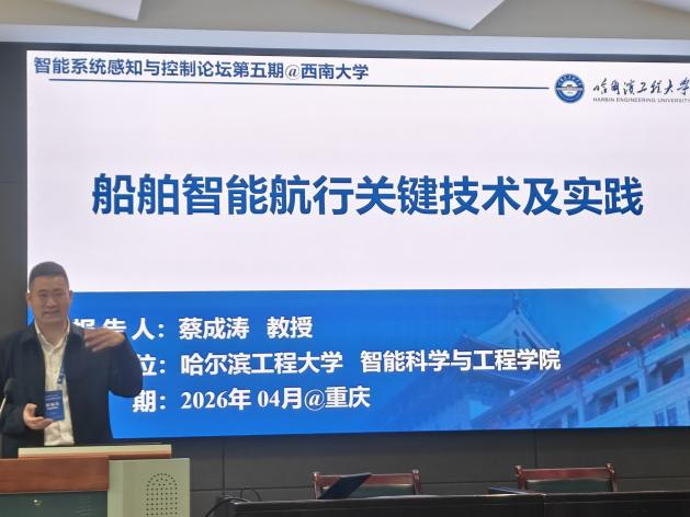 4月11日下午,首个报告由国家级青年人才、重庆大学自动化学院院长苏晓杰教授主持。教育部国家级人才、哈尔滨工程大学智能科学与工程学院院长蔡成涛教授聚焦《船舶智能航行关键技术及实践》,介绍了船舶智能感知、数字孪生技术在船舶智能航行中涉及的关键技术,并结合船舶在极地环境下的智能航行应用案例进行了探讨。