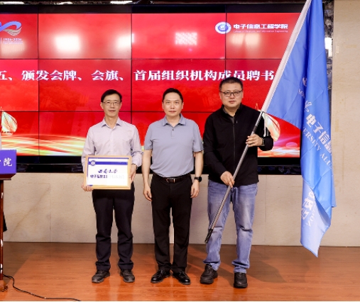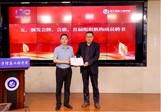 接着,大会通过西南大学电子信息工程学院校友会组织机构成员名单。在授牌授旗仪式上,唐军为学院颁发会牌、会旗,执行会长李传东、会长李鸿一上台接牌、接旗。同时为校友会组织机构成员颁发聘书。